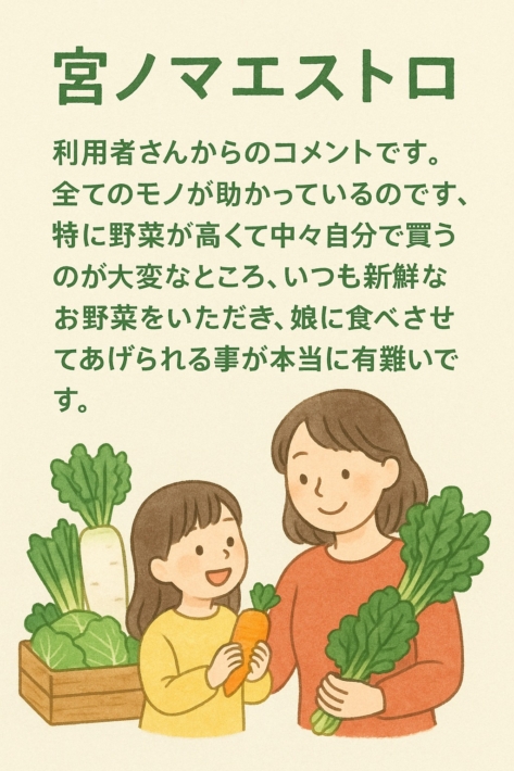 “Everything we receive is helpful, but I’m especially grateful for the fresh vegetables. Vegetables are so expensive these days that it’s hard to buy them myself. I really appreciate being able to give my daughter healthy fresh food.”