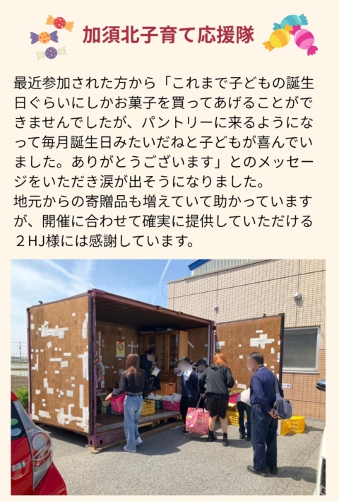 “Until now, I could only buy sweets for my child on their birthday. But since we started coming to the pantry, my child says, ‘It feels like it’s my birthday every month!’ and was so happy. Thank you so much.”