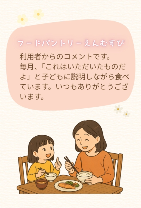 A comment from one of our recipients: “Every month, I explain to my child, ‘This is something we received from the pantry,’ as we eat together. Thank you always for your support.”