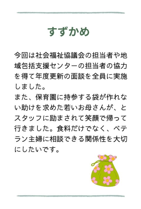 With the support of staff from the Social Welfare Council and the Community Comprehensive Support Center, we were able to carry out annual renewal interviews with all participants this time.