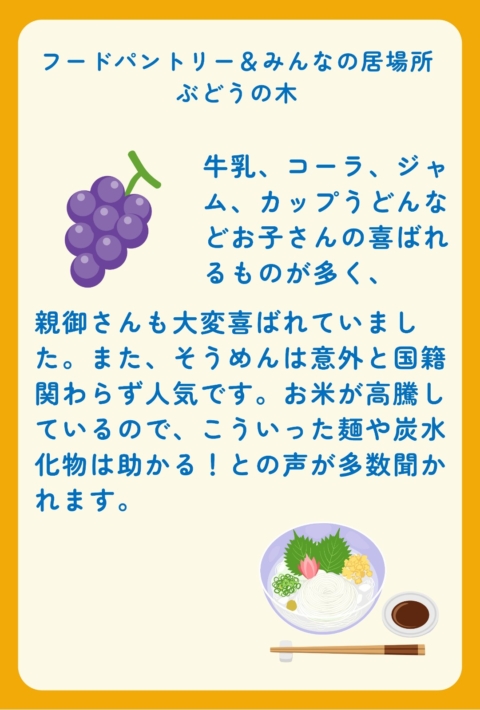 There were many items that children especially enjoyed, such as milk, cola, jam, and cup noodles, and parents were also very pleased. Sōmen noodles, in particular, are surprisingly popular regardless of nationality. With rice prices continuing to rise, we heard many people say that noodles and other carbohydrate-based foods like these are a great help.