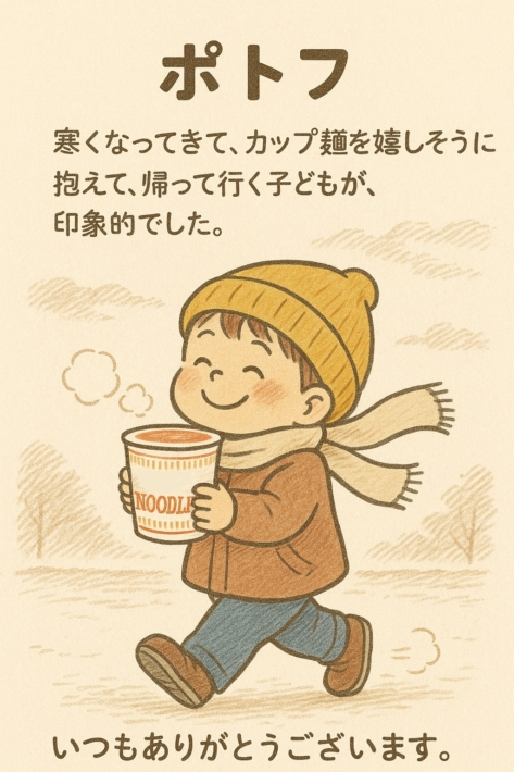 As the weather has gotten colder, it was memorable to see a child happily clutching a cup of instant noodles as they headed home. Thank you, as always, for your continued support.