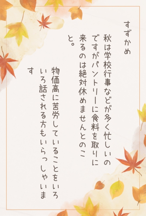 Our pantry users are very busy in the fall due to many school events, but they say they absolutely cannot miss coming to the pantry to pick up food.