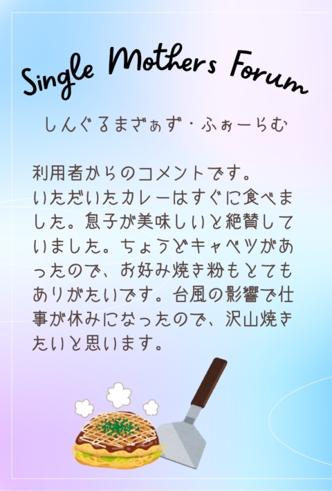 Comments from users. “I ate the curry that 2HJ gave us right away with my family. My son raved that it was delicious. I just had cabbage, so okonomiyaki powder is also very helpful. I have a day off from work because of the typhoon, so I want to bake a lot.”