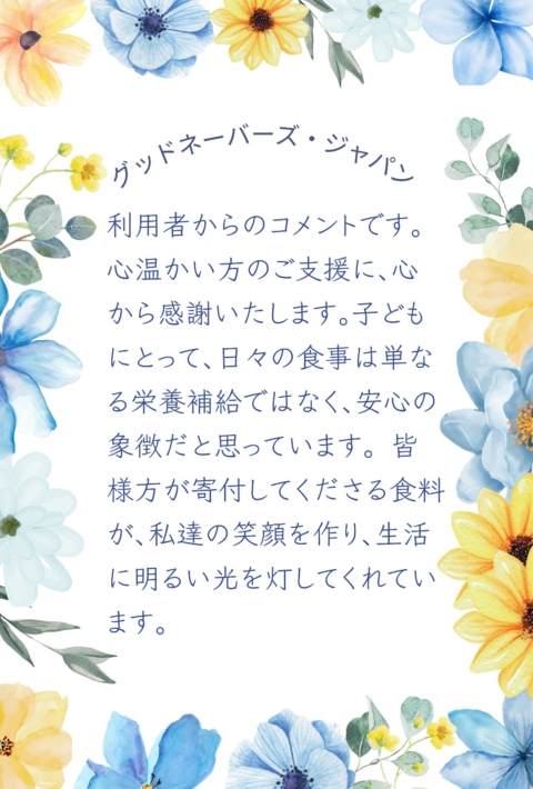 Comments from our users. “I’m deeply grateful to your kind support. I think that daily meals are not just nourishment but a symbol of peace of mind for children. The food you donate makes us smile and lights up our life.“
