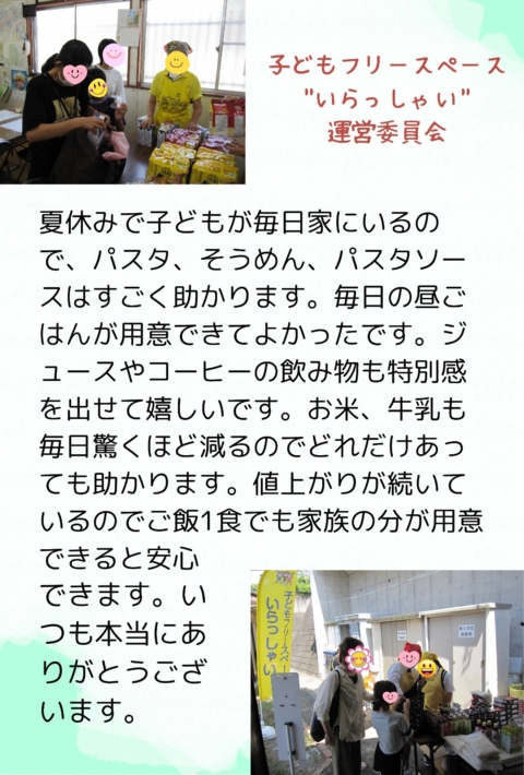 It is summer vacation now and my children are at home every day, so pasta, somen noodles and pasta sauce are very helpful. I’m happy to be able to prepare lunch for my children every day. Drinks like juice and coffee also make me feel special. Rice and milk are very helpful because the stock of rice and milk is decreasing amazingly every day. As the price of rice continues to rise, I feel relieved if I can prepare for my family even for one meal. Thank you very much as always.