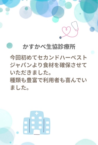 This was our first time receiving food supplies from Second Harvest Japan. The variety was abundant, and our recipients were very pleased.