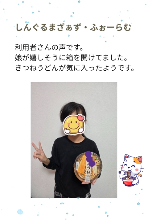 Here’s a message from one of our users: “My daughter opened the box with such excitement. She especially loved the cup-style kitsune udon.”