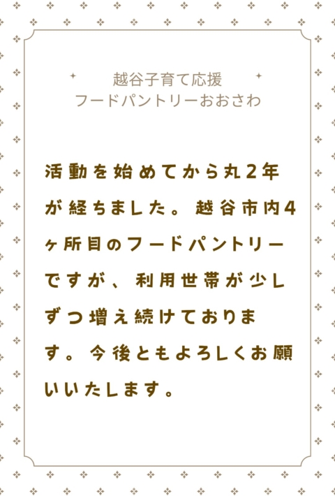 Two years have passed since we started our food pantry. This is the fourth food pantry in Koshigaya City, and the number of users of our facility are gradually increasing. Thank you for your continued support.