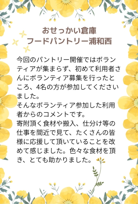 “By helping out, I was able to see up close how donated food is delivered and sorted. It made me realize once again how many people are supporting us. Receiving such a variety of food was also a great help to me.”