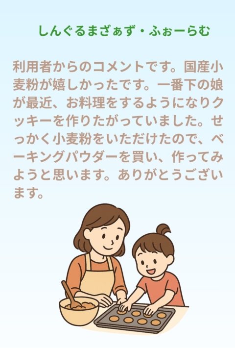 “I was so happy to receive domestic wheat flour. My youngest daughter has recently taken an interest in cooking and wanted to try making cookies. Since we were given the flour, I’ll buy some baking powder and give it a try. Thank you so much.”