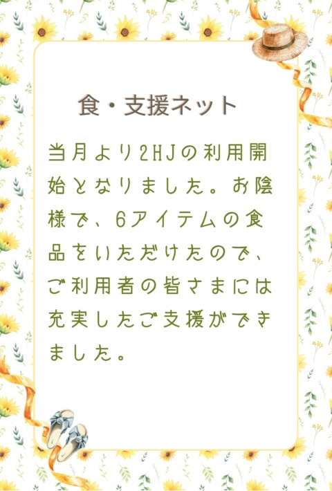 We began receiving support from 2HJ this month. Thanks to that, we were able to provide six different food items, allowing us to offer substantial assistance to our recipients.